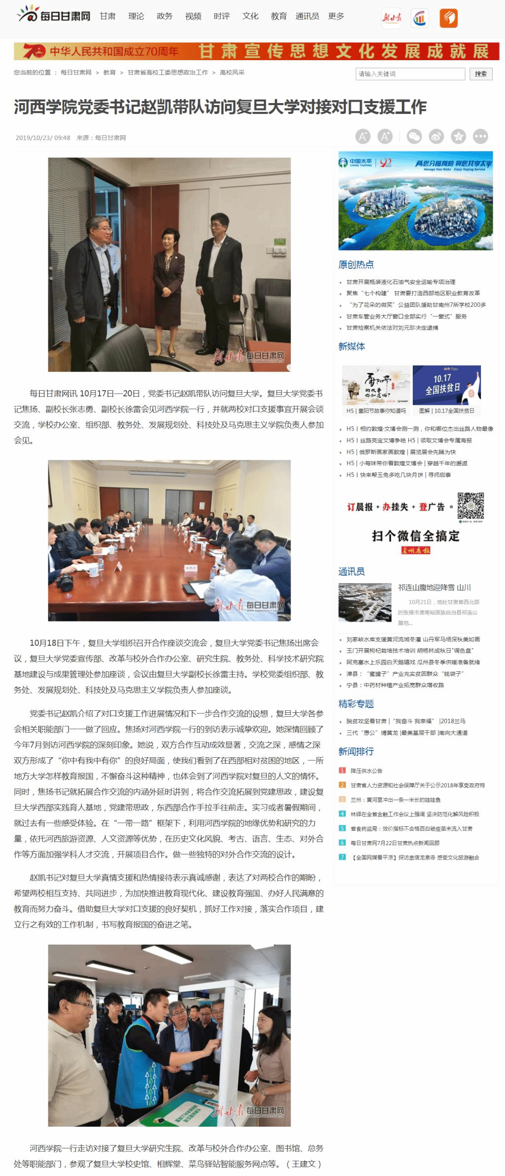 每日甘肃网讯 10月17日—20日,党委书记赵凯带队访问复旦大学。复旦大学党委书记焦扬、副董事长张志勇、副董事长徐雷会见williamhill官网一行,并就两校对口支援事宜开展会谈交流,公司办公室、组织部、教务处、发展规划处、科技处及williamhill官网负责人参加会见。