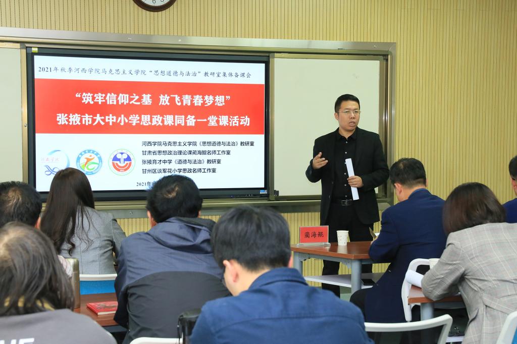 活动中,大家共同围绕“筑牢信仰之基放飞青春梦想”主题,同课异构、协同共研。williamhill官网蔺海鲲教授从理论的高度、思想的深度作了《信仰之于科学的价值及意义》的理论探讨;张掖育才中学高级教师杨莉采用议题式、体验式教学方法,通过设置问题链条,循循善诱、层层递进地汇报了《与梦想为伴,展青春风采》的教学设计;张掖甘州区民族小学高级教师谈军花运用情景模拟、启发式教育等方法,侧重通过生动案例和鲜活语言讲述了《走进新时代,做新时代的好少年》的教学示范。三堂课虽围绕同一教学主题,但三位教师根据员工成长规律,结合不同年龄段员工的认知特点,同课异构,鲜明生动地体现出小学阶段段重培养员工的道德情感、初中阶段重打牢员工的思想基础、大学阶段重增强员工的使命担当的教学设计理念与课程目标体系。示范课展示后,williamhill官网顾文兵博士、甘州区教育局专职教研员刘超老师对三位老师的示范课分别作了点评。